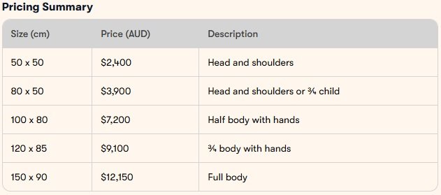 Prices are in Australian dollars and cover unframed, fully finished portraits with simple clothing and plain backgrounds.